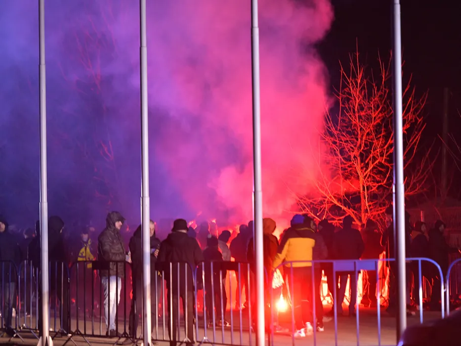 Suporterii ploiesteni cu fumigene la meciul de fotbal dintre Unirea Constanta si Petrolul Ploiesti, contand pentru Liga a-2-a Casa Pariurilor, desfasurat pe terenul de iarba al Complexului National de Fotbal de la Buftea, joi 10 martie 2022. © FOTO:Razvan Pasarica/SPORT PICTURES