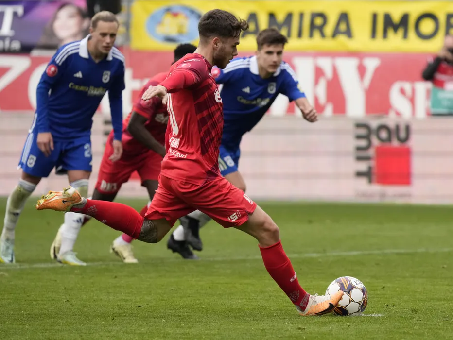 Andrej Fabry execută o lovitură de la 11m în meciul de fotbal dintre UTA Arad si FCU 1948 Craiova, contând pentru Superliga Superbet, desfășurat pe Arena Francisc Neuman din Arad, sâmbătă 2 martie 2024. © FOTO: Alexandra FECHETE/SPORT PICTURES