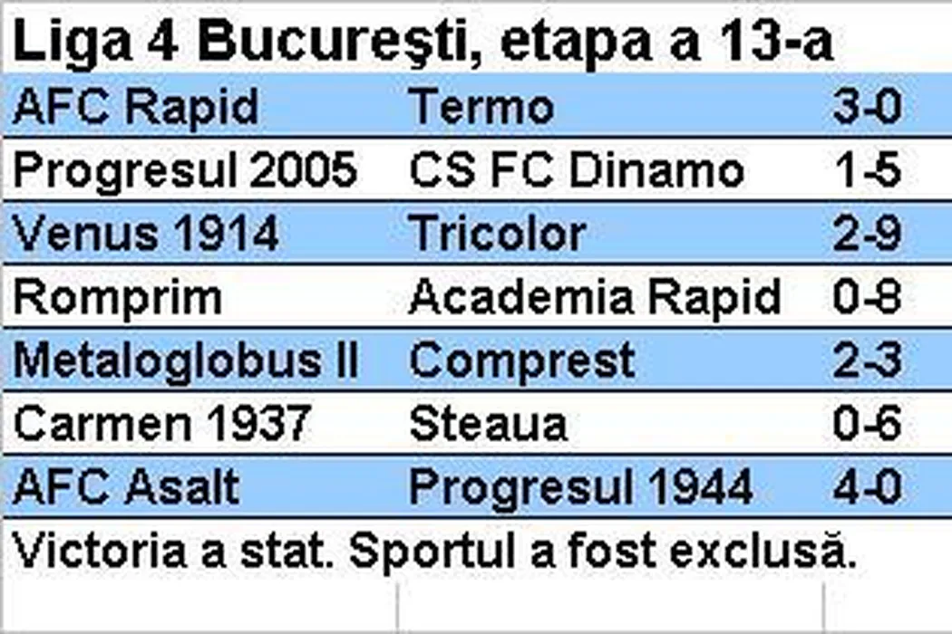 Liga 4, etapa a 13-a: Steaua și Academia Rapid, golaveraj 14-0 în deplasările la Carmen și Romprim. Dinamo – Badea urcă pe locul 4, AFC Rapid ajunge la a treia victorie consecutivă și suflă în ceafa „roș-albilor”. Rezultate + clasament