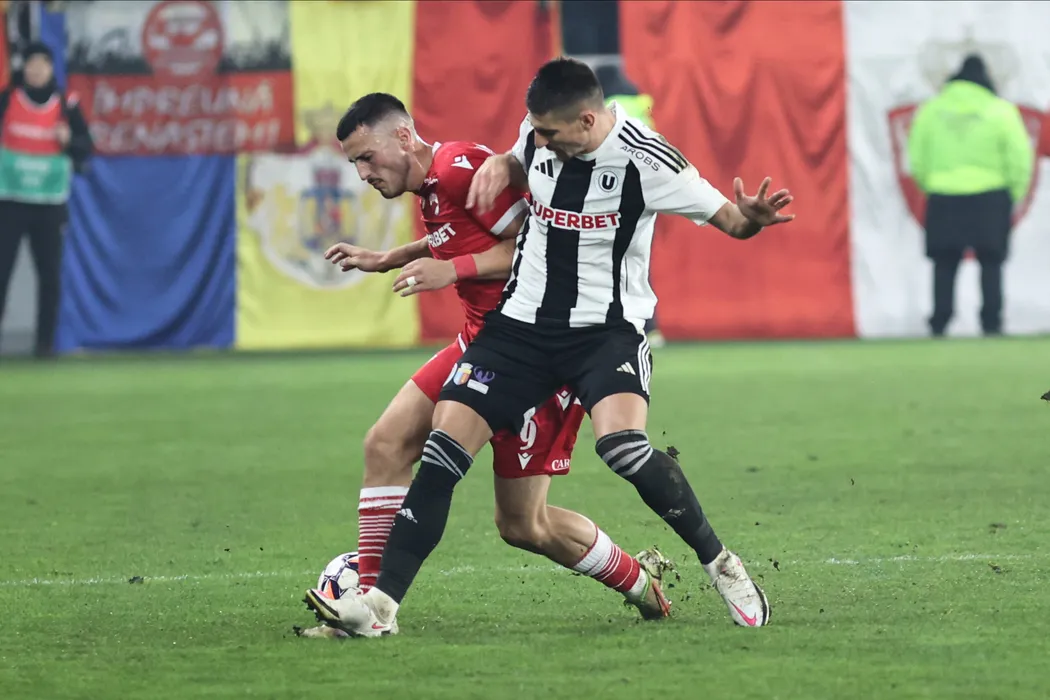 Selmani Astrit si Lucian Iulian Cristea in meciul de fotbal dintre Dinamo Bucuresti si Universitatea Cluj, contand pentru SuperLiga Superbet, desfasurat pe Stadionul Arcul de Triumf din Bucuresti, vineri 24 ianuarie 2025. © FOTO: Gheorghe Fluster/SPORT PICTURES