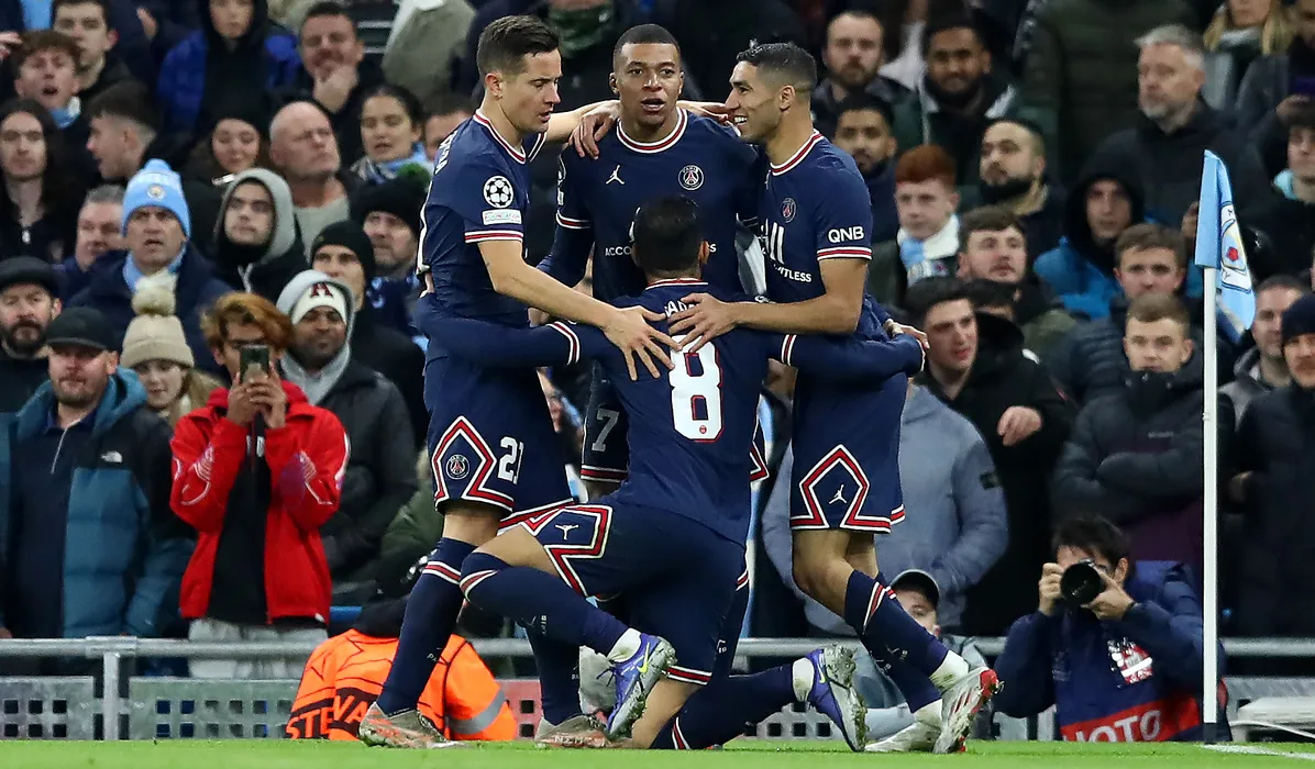 MANCHESTER, ENGLAND - NOVEMBER 24: Kylian Mbappe of Paris Saint-Germain celebrates with teammates Ander Herrera, Leandro Paredes and Achraf Hakimi after scoring their team's first goal during the UEFA Champions League group A match between Manchester City and Paris Saint-Germain at Etihad Stadium on November 24, 2021 in Manchester, England. (Photo by Jan Kruger - UEFA/UEFA via Getty Images)
