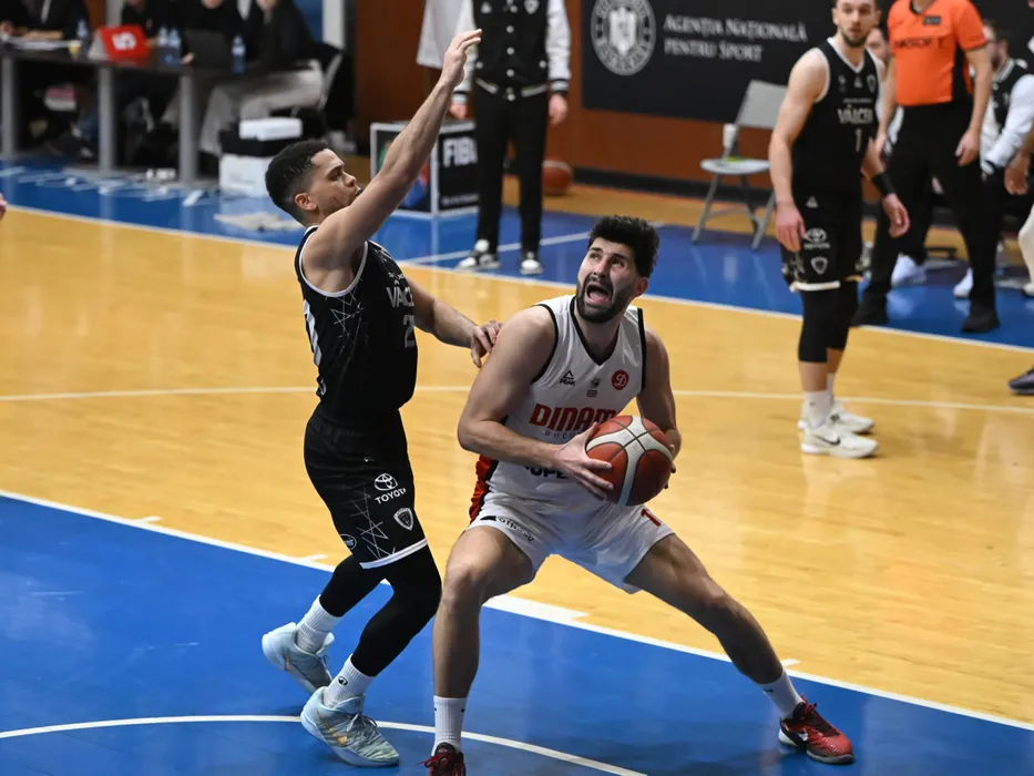Emmanuel Lacomte si Nandor Levente Kuti in meciul de baschet masculin dintre Dinamo Bucuresti si CS Valcea, din cadrul Ligii Nationale Getica 95, desfasurat in Arena de Baschet din Bucuresti, luni 5 ianuarie 2026. © FOTO:Razvan Pasarica/SPORT PICTURES
