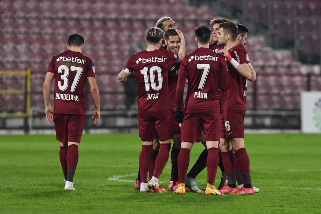 Jucatorii formatiei CFR Cluj reactioneaza dupa ce au inscris un gol in timpul meciului de fotbal contra echipei CSM Politehnica Iasi din etapa a XXVII-a a Ligii 1, disputat pe stadionul Dr. Constantin Radulescu din Cluj-Napoca, duminica, 14 martie 2021 FLAVIU BUBOI / MEDIAFAX FOTO