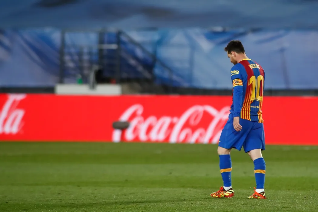 April 10, 2021, VALDEBEBAS, MADRID, SPAIN: MADRID, SPAIN - APRIL 10: Lionel (Leo) Messi of FC Barcelona laments during the spanish league, La Liga, football match played between Real Madrid and FC Barcelona at Alfredo Di Stefano stadium on April 10, 2021 in Madrid, Spain.,Image: 604647142, License: Rights-managed, Restrictions: , Model Release: no