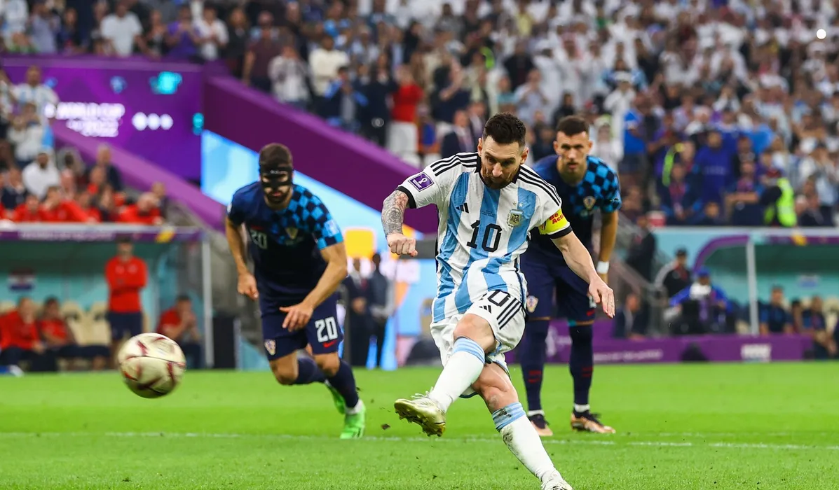 Lionel Messi of Argentina scores the opening goal 1-0 from a penalty Argentina v Croatia, FIFA World Cup 2022, Semi Final, Football, Lusail Stadium, Al Daayen, Qatar - 13 Dec 2022,Image: 744406038, License: Rights-managed, Restrictions: Editorial Use Only, Model Release: no