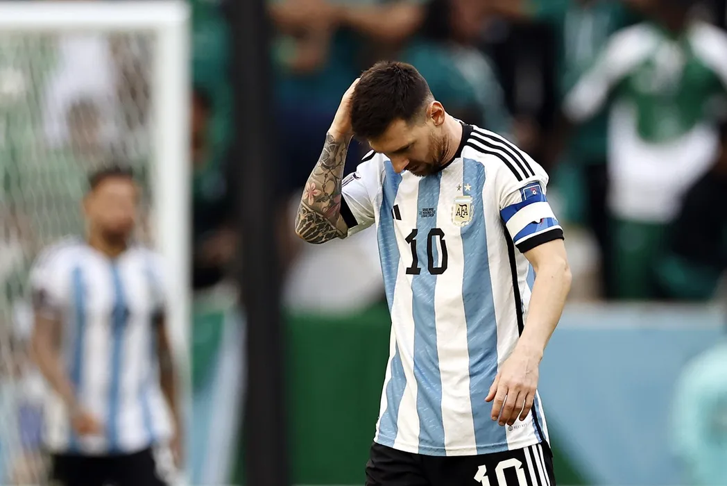 Lionel Messi of Argentina reacts during the FIFA World Cup Qatar 2022 group C match between Argentina and Saudi Arabia at Lusail Stadium on November 22, 2022 in Lusail City, Qatar.