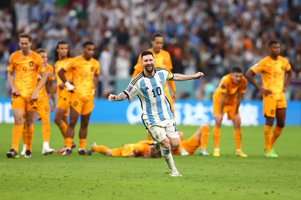 LUSAIL CITY, QATAR - DECEMBER 09: Lionel Messi of Argentina celebrates winning the penalty shoot-out following the FIFA World Cup Qatar 2022 quarter final match between Netherlands and Argentina at Lusail Stadium on December 09, 2022 in Lusail City, Qatar. (Photo by Chris Brunskill/Fantasista/Getty Images)