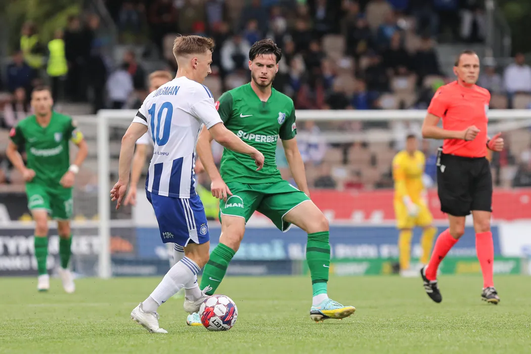 Lucas Lingman si Tudor Cristian Baluta in meciul de fotbal dintre HJK Helsinki si Farul Constanta, contand pentru UEFA Europa Conference League, desfasurat pe Helsinki Football Stadium din Helsinki, joi 31 august 2023. © FOTO:Antonio Vasile/SPORT PICTURES