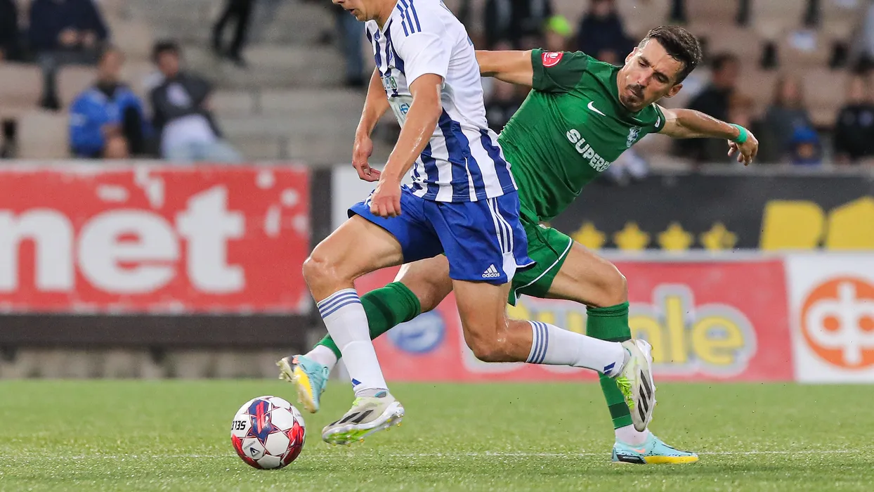 Topi Keskinen si Andrei Viorel Artean in meciul de fotbal dintre HJK Helsinki si Farul Constanta, contand pentru UEFA Europa Conference League, desfasurat pe Helsinki Football Stadium din Helsinki, joi 31 august 2023. © FOTO:Antonio Vasile/SPORT PICTURES