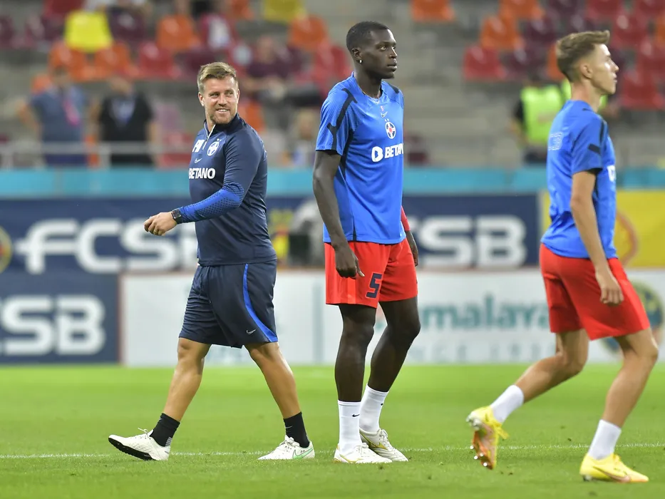 Mihai Pintilii la incalzire alaturi de Joyskim Aurelien Dawa Tchakonte la meciul de fotbal dintre FCSB si Chindia Targoviste, contand pentru Superliga Superbet, desfasurat pe Arena Nationala din Bucuresti, duminica 14 august 2022. © FOTO:Razvan Pasarica/SPORT PICTURES