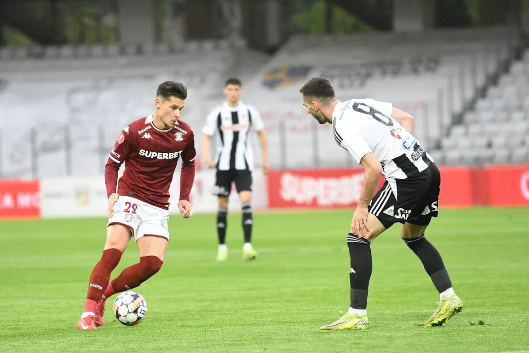 Mihai Alexandru Dobre si Dorin Marian Codrea in meciul de fotbal dintre FC Universitatea Cluj si FC Rapid 1923 Bucuresti, contand pentru Superliga Superbet Play-Off, desfasurat pe Stadionul Cluj Arena din Cluj-Napoca, sambata 24 mai 2025. © FOTO: Flaviu Buboi/SPORT PICTURES
