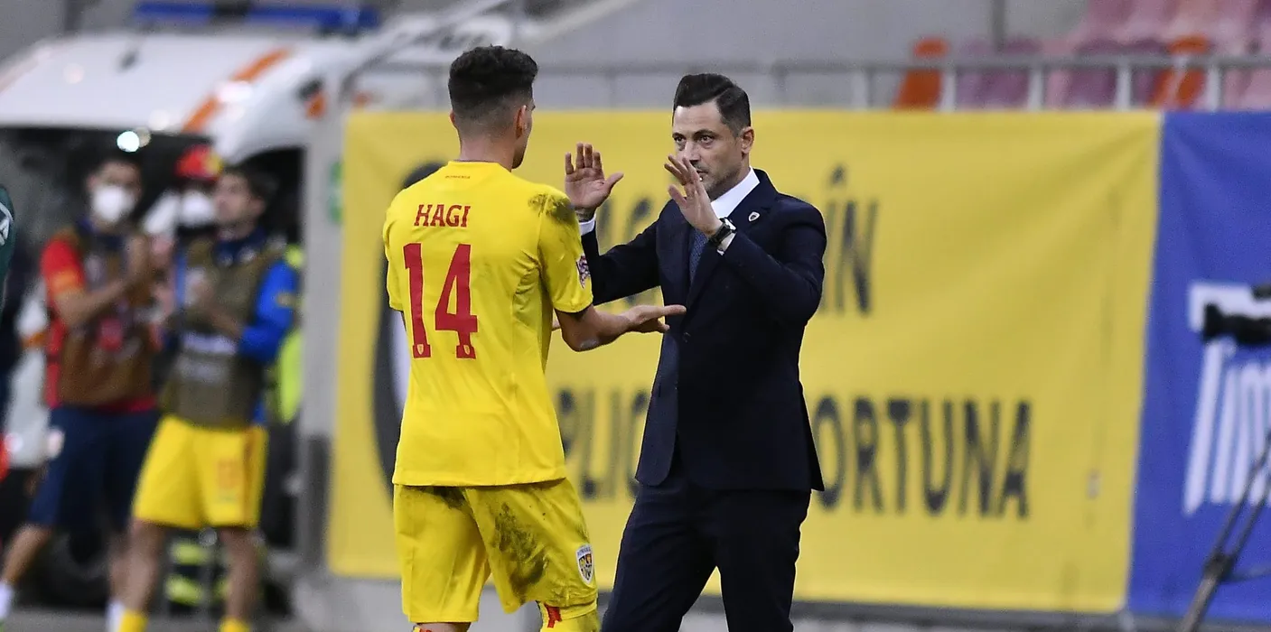 Mirel Radoi il felicita pe Ianis Hagi in meciul de fotbal dintre Romania si Irlanda de Nord, contand pentru Liga Natiunilor, desfasurat fara spectatori pe Arena Nationala din Bucuresti, vineri 4 septembrie 2020. © FOTO:Razvan Pasarica/SPORT PICTURES