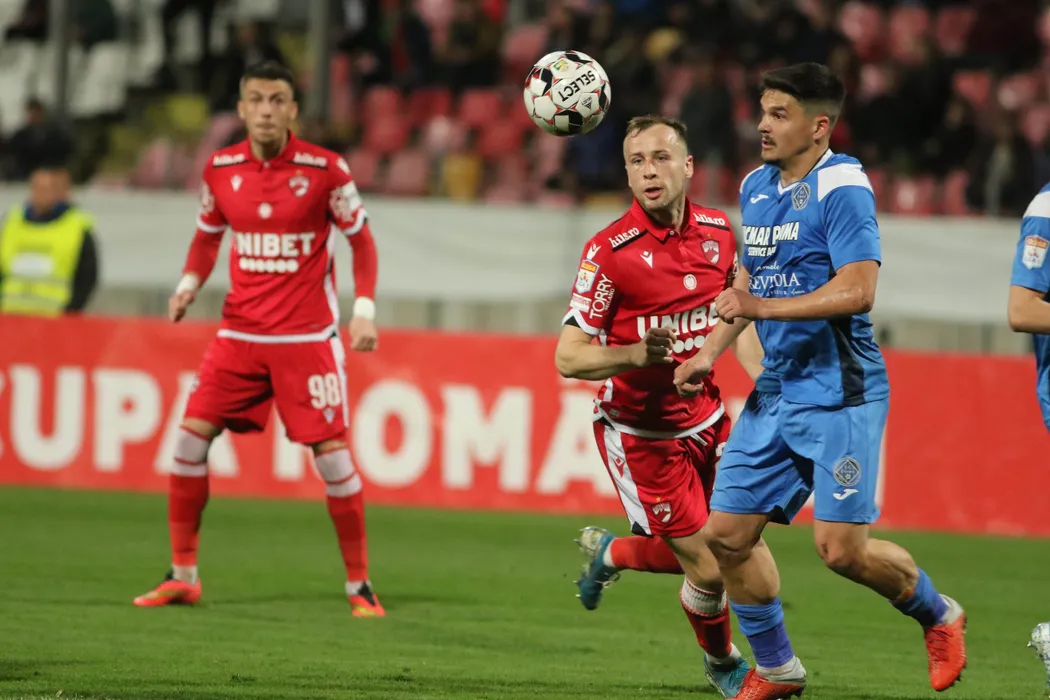 Filip Mrzljak (C), de la Dinamo Bucuresti, lupta pentru balon cu Alexandru Buziuc (D), de la Academica Clinceni, in timpul meciului de fotbal din sferturile de finala ale Cupei Romaniei, disputat la stadionul Stefan Cel Mare din Bucuresti, marti, 3 martie 2020. GEORGE FILIP / MEDIAFAX FOTO