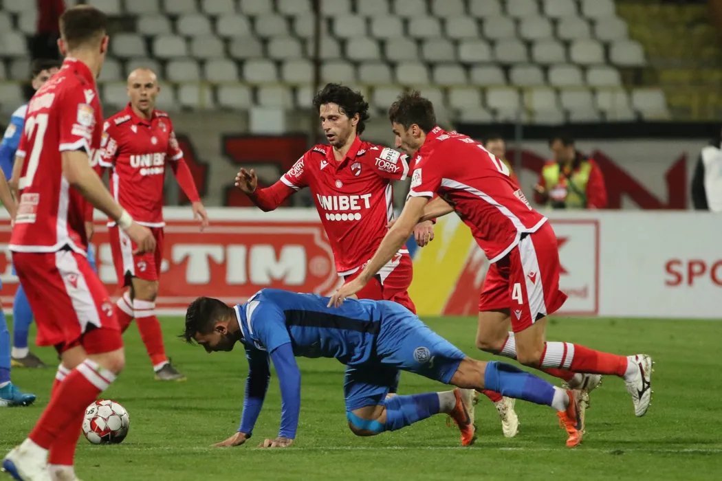 Florin Achim (jos), de la Academica Clinceni, cade pe gazon in timpul meciului de fotbal contra echipei Dinamo Bucuresti, din sferturile de finala ale Cupei Romaniei, disputat la stadionul Stefan Cel Mare din Bucuresti, marti, 3 martie 2020. GEORGE FILIP / MEDIAFAX FOTO