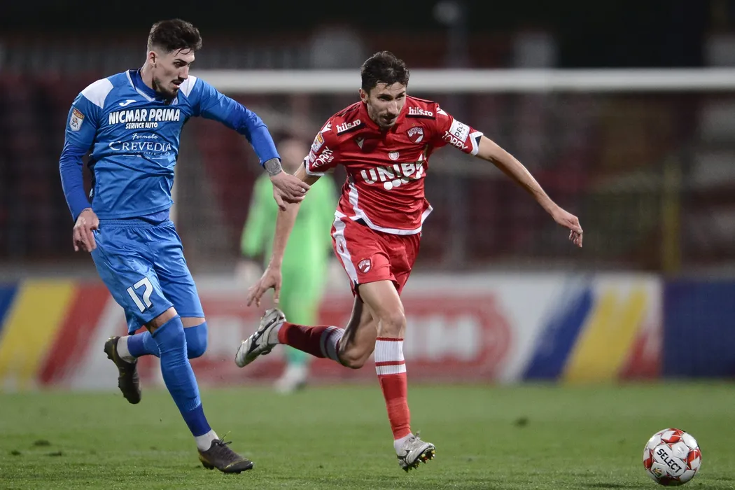 Ioan Filip (D), de la Dinamo Bucuresti, lupta pentru balon cu Alexandru Albu (S), de la Academica Clinceni, in timpul meciului de fotbal din sferturile de finala ale Cupei Romaniei, disputat la stadionul Stefan Cel Mare din Bucuresti, marti, 3 martie 2020. ALEXANDRU DOBRE / MEDIAFAX FOTO