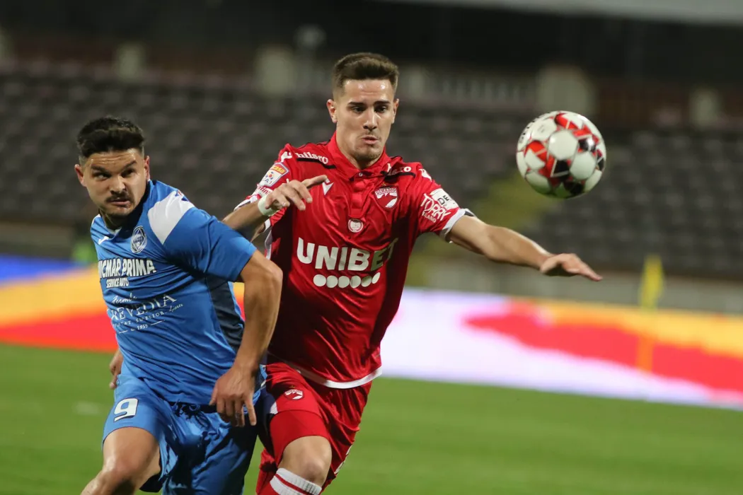 Ricardo Griore (D), de la Dinamo Bucuresti, lupta pentru balon cu Alexandru Buziuc (S), de la Academica Clinceni, in timpul meciului de fotbal din sferturile de finala ale Cupei Romaniei, disputat la stadionul Stefan Cel Mare din Bucuresti, marti, 3 martie 2020. GEORGE FILIP / MEDIAFAX FOTO