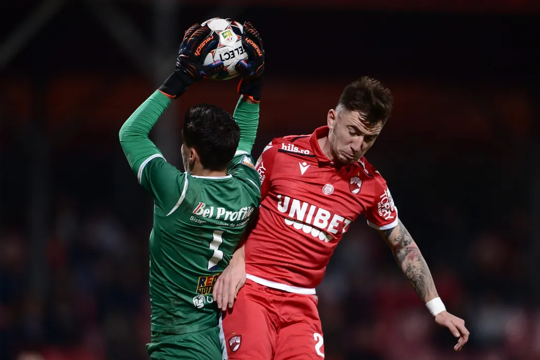Deian Sorescu (D), de la Dinamo Bucuresti, lupta sa inscrie in timpul meciului de fotbal contra echipei Academica Clinceni, din sferturile de finala ale Cupei Romaniei, disputat la stadionul Stefan Cel Mare din Bucuresti, marti, 3 martie 2020. ALEXANDRU DOBRE / MEDIAFAX FOTO