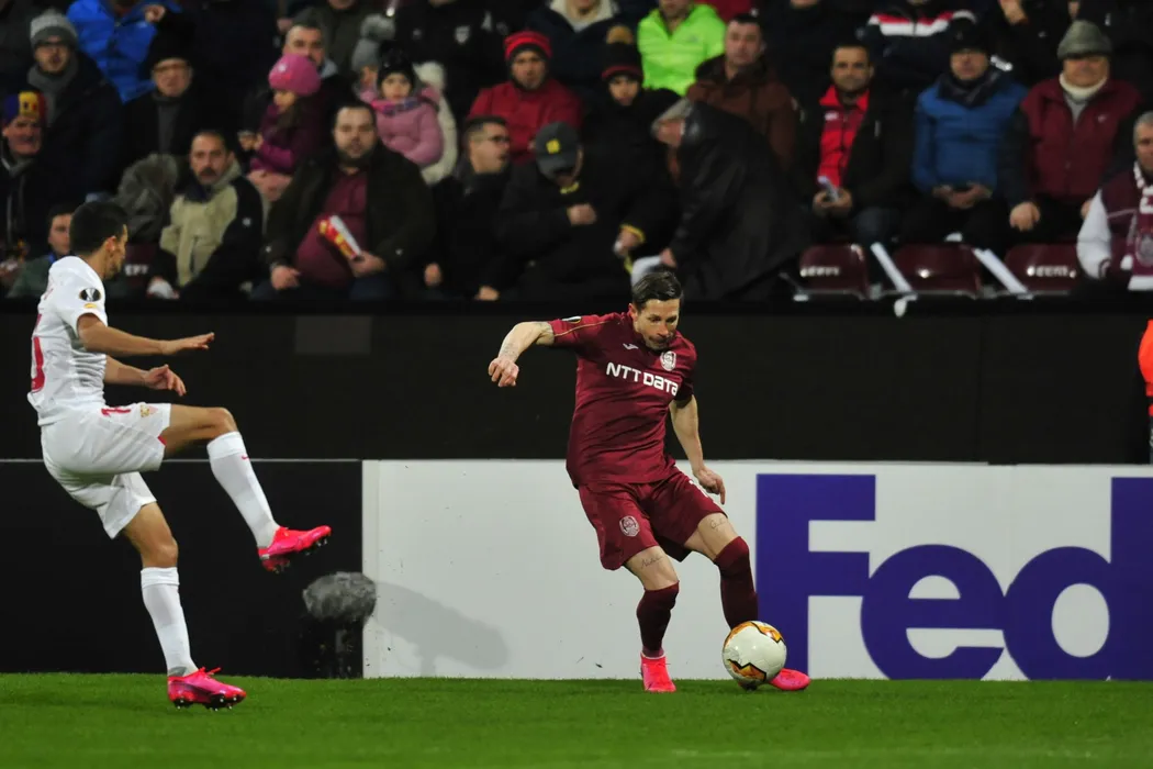 Ciprian Deac (D), de la CFR Cluj, suteaza in timpul meciului de fotbal contra echipei Sevilla, din 16-imile Europa League, mansa tur, disputat pe stadionul Dr. Constantin Radulescu din Cluj-Napoca, joi, 20 februarie 2020. DAN HORIA TAUTAN / MEDIAFAX FOTO