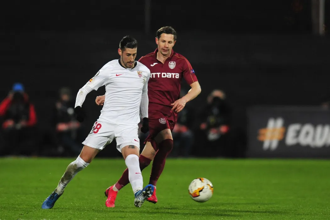Ciprian Deac (D), de CFR Cluj, lupta pentru balon cu Escudero (S), de la Sevilla, in timpul meciului de fotbal din 16-imile Europa League, man?a tur, disputat pe stadionul Dr. Constantin Radulescu din Cluj-Napoca, joi, 20 februarie 2020. DAN HORIA TAUTAN / MEDIAFAX FOTO