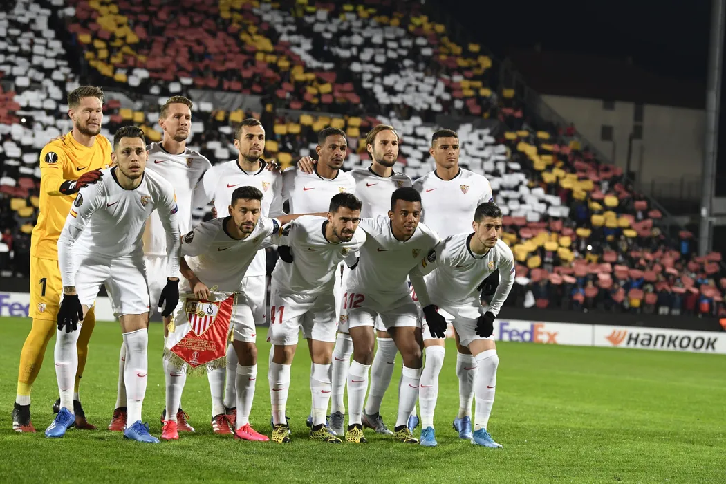 Jucatorii formatiei Sevilla pozeaza inainte de inceperea meciului de fotbal contra echipei CFR Cluj din 16-imile Europa League, mansa tur, disputat pe stadionul Dr. Constantin Radulescu din Cluj-Napoca, joi, 20 februarie 2020 FLAVIU BUBOI / MEDIAFAX FOTO