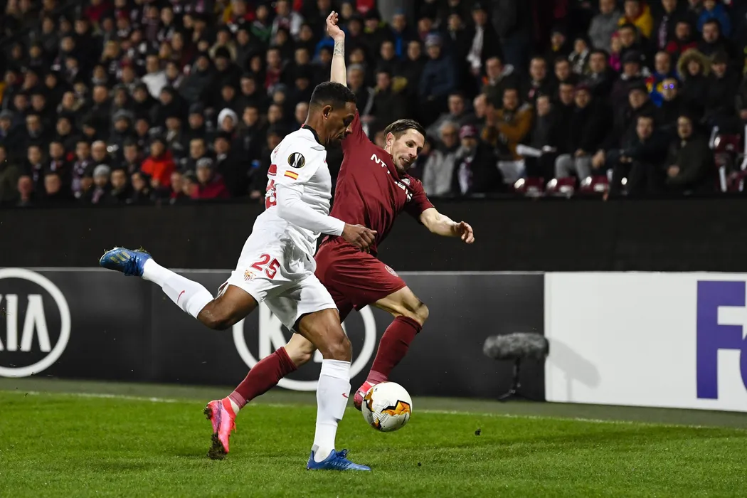 Ciprian Deac (D), de CFR Cluj, lupta pentru balon cu Fernando (S), de la Sevilla, in timpul meciului de fotbal din 16-imile Europa League, manșa tur, disputat pe stadionul Dr. Constantin Radulescu din Cluj-Napoca, joi, 20 februarie 2020. FLAVIU BUBOI / MEDIAFAX FOTO