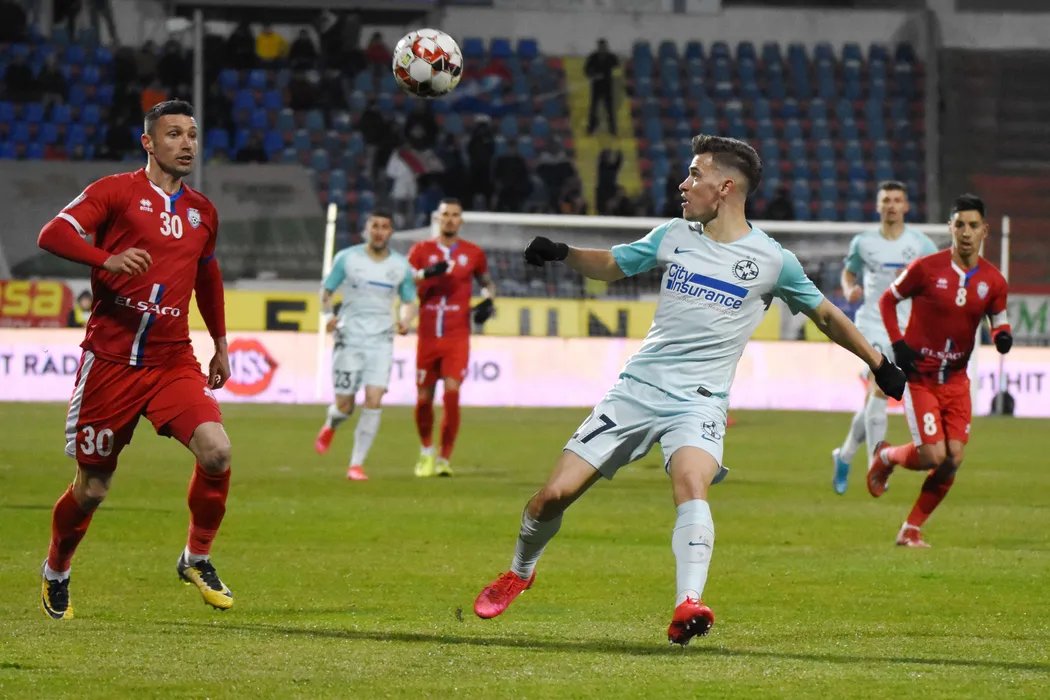 Alexandru Tiganasu (S), de la FC Botosani, lupta pentru balon cu Darius Olaru (D), de la FCSB, in timpul meciului de fotbal din prima etapa a play - off - ului Ligii 1, disputat la stadionul Municipal din Botosani, sambata, 29 februarie 2020. DRAGOS PASCANEANU / MEDIAFAX FOTO