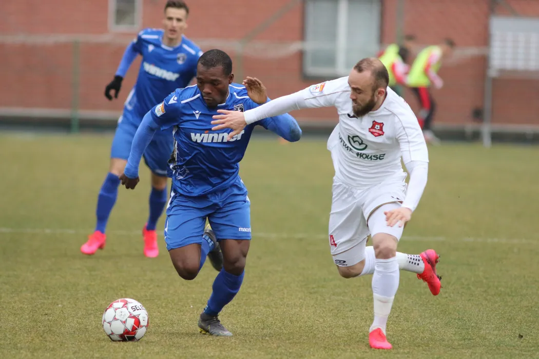 Moussa Sanoh (S), de la FC Voluntari, lupta pentru balon cu Sorin Busu (D), de la AFC Hermannstadt, in timpul meciului de fotbal din etapa 26 a Ligii 1, disputat pe stadionul Anghel Iordanescu din Voluntari, sambata, 22 februarie 2020. GEORGE FILIP / MEDIAFAX FOTO