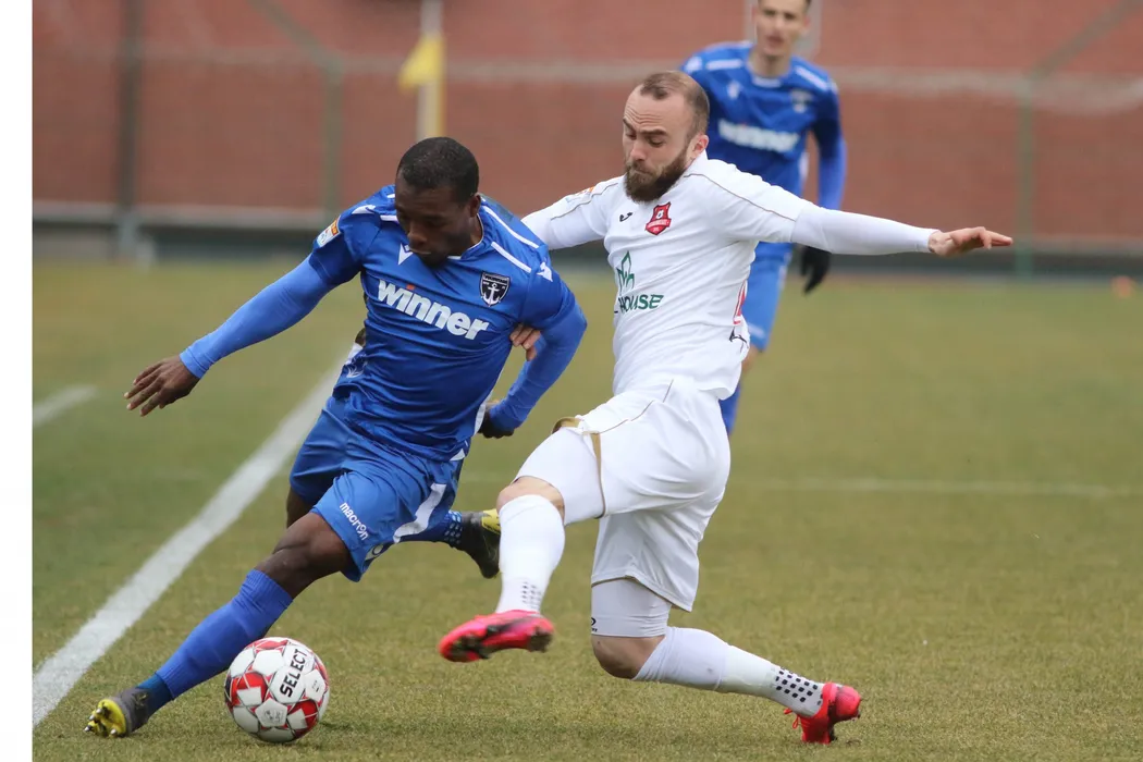 Moussa Sanoh (S), de la FC Voluntari, lupta pentru balon cu Sorin Busu (D), de la AFC Hermannstadt, in timpul meciului de fotbal din etapa 26 a Ligii 1, disputat pe stadionul Anghel Iordanescu din Voluntari, sambata, 22 februarie 2020. GEORGE FILIP / MEDIAFAX FOTO