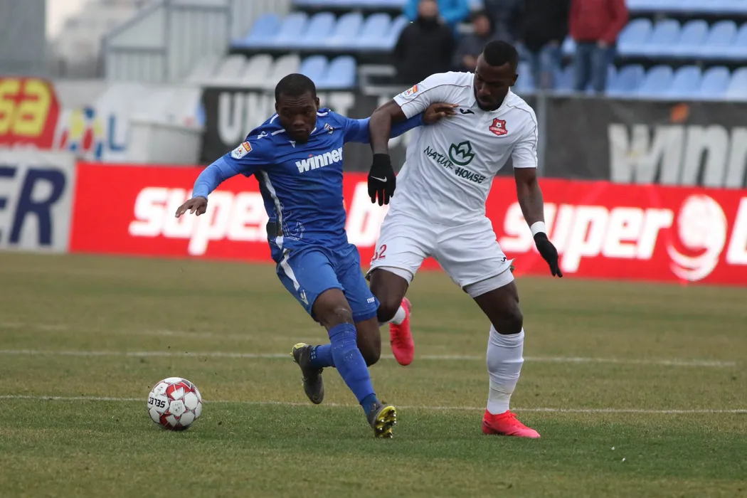 Moussa Sanoh (S), de la FC Voluntari, lupta pentru balon cu Romario Pires (D), de la AFC Hermannstadt, in timpul meciului de fotbal din etapa 26 a Ligii 1, disputat pe stadionul Anghel Iordanescu din Voluntari, sambata, 22 februarie 2020. GEORGE FILIP / MEDIAFAX FOTO