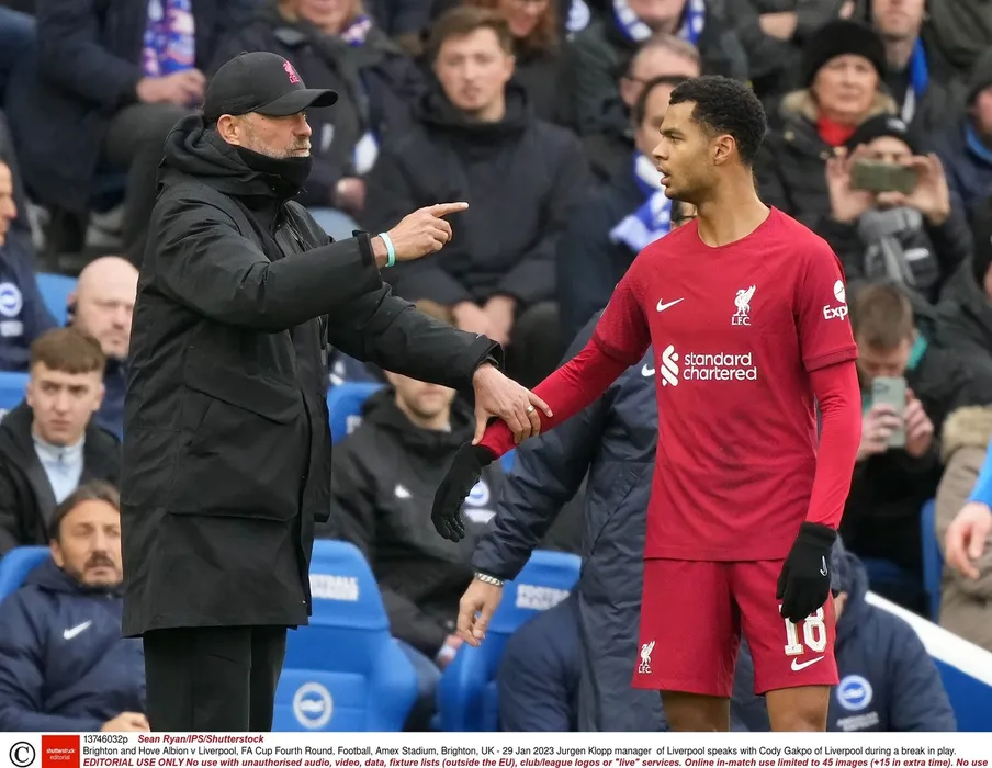 Jurgen Klopp manager of Liverpool speaks with Cody Gakpo of Liverpool during a break in play.