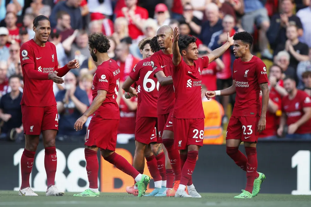 Fabio Carvalho of Liverpool celebrates scoring his side's eighth goal to make the score 8-0 Liverpool v Bournemouth, Premier League, Football, Anfield, Liverpool, UK - 27 Aug 2022,Image: 717000912, License: Rights-managed, Restrictions: EDITORIAL USE ONLY No use with unauthorised audio, video, data, fixture lists, club/league logos or "live" services. Online in-match use limited to 120 images, no video emulation. No use in betting, games or single club/league/player publications., Model Release: no