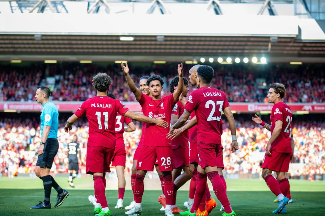 GOAL 8-0! Liverpool's midfielder Fabio Carvalho (28) scores and celebrates during the Premier League match between Liverpool and Bournemouth at Anfield, Liverpool