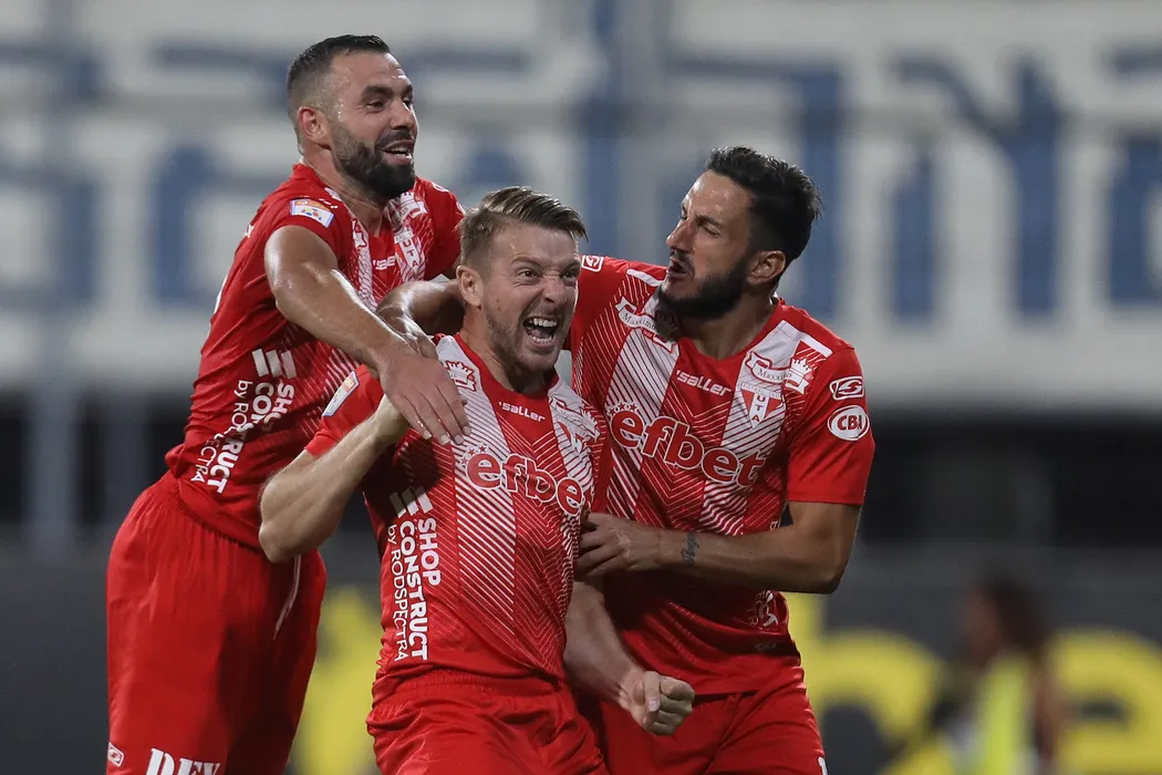 Liviu Antal (C), de la UTA Arad, reactioneaza dupa ce a inscris un gol in meciul de fotbal contra echipei CS Universitatea Craiova din etapa a V-a a Ligii 1, disputat pe stadionul Francisc Neuman din Arad, sambata, 14 august 2021. CIPRIAN PETCUT / MEDIAFAX FOTO