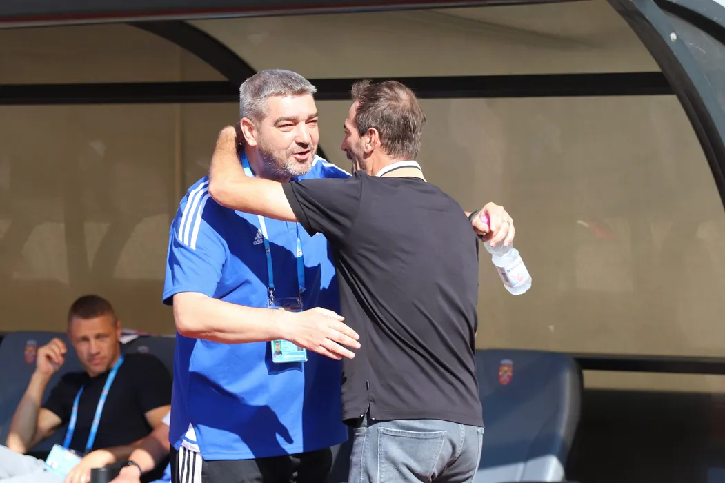 Cei doi antrenori Marius Măldărașanu și Liviu Ciobotariu se salută înaintea meciului de fotbal dintre AFC Hermannstadt Sibiu si FC Botoșani, peru Superliga Superbet, desfășurat pe Stadionul Municipal din Sibiu, sâmbătă 10 august. © FOTO: Valentin MACREA/SPORT PICTURES