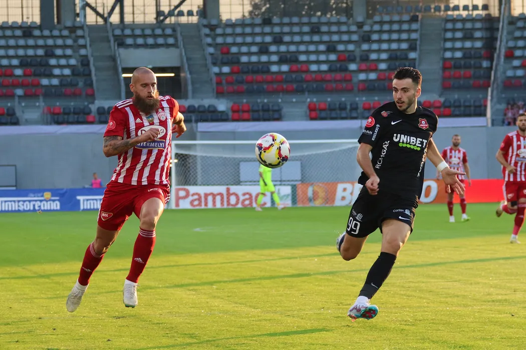 Ruben Miguel in duel cu Ninaj Branislav in meciul de fotbal dintre AFS HERMANNSTADT SIBIU si SEPSI OSK SFANTU GHEORGHE contand pentru CUPA ROMANIEI BETANO, desfasurat pe Stadionul Municipal din Sibiu, miercuri 27 septembrie 2023. © FOTO: Valentin MACREA/SPORT PICTURES