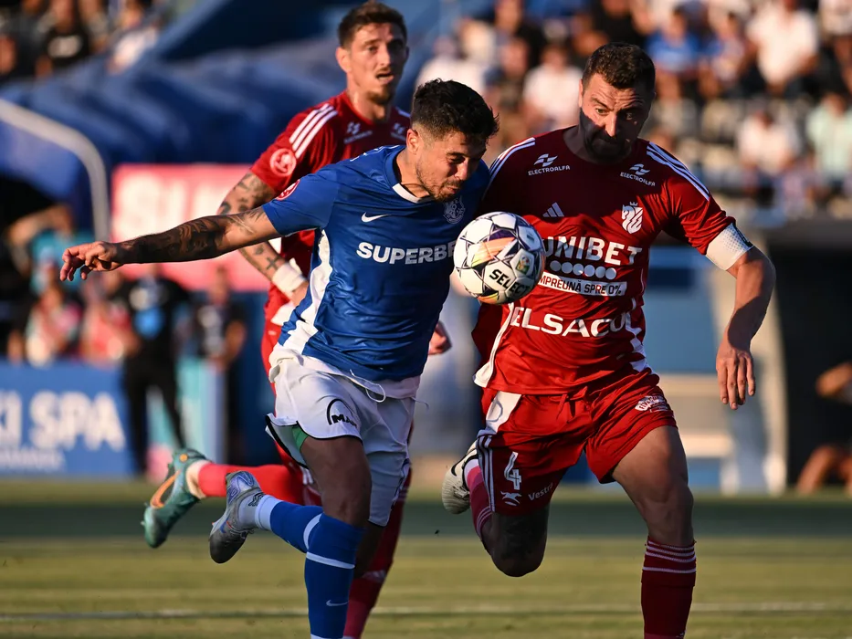 Gabriel Cristian Iancu si Andrei George Miron in meciul de fotbal dintre Farul Constanta si FC Botosani, contand pentru Superliga Superbet, desfasurat pe Stadionul central al Academiei Gheorghe Hagi din Ovidiu, duminica 28 iulie 2024. © FOTO:Razvan Pasarica/SPORT PICTURES