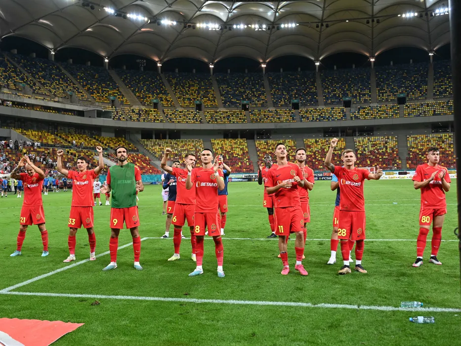 Fotbalistii stelisti Vlad Iulian Chiriches,Risto Radunovic,Andrea Compagno, Denis Gratian Harut, Adrian Gheorghe Sut, Denis Gratian Harut, David Raul Miculescu, Mihai Daniel Lixandru si Grigoras Alexandru Pantea saluta galeria dupa meciul de fotbal dintre FCSB si Politehnica Iasi, din cadrul Superligii Superbet, desfasurat pe Arena Nationala din Bucuresti, duminica 20 august 2023. © FOTO:Razvan Pasarica/SPORT PICTURES