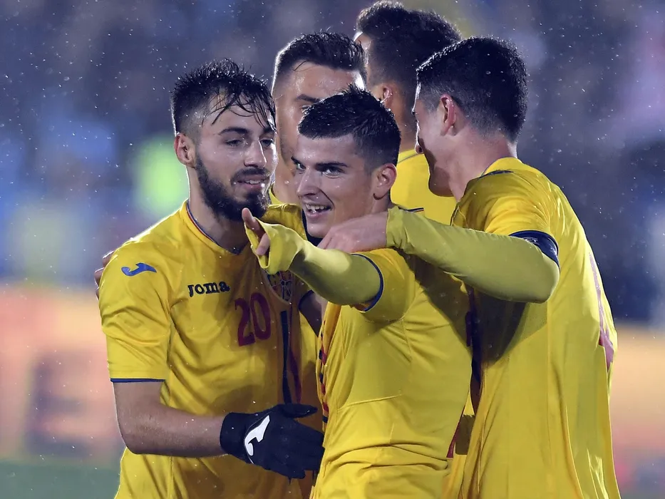 Valentin Mihaila se bucura dupa un nou gol marcat alaturi de Virgil Ciobanu in meciul de fotbal dintre Romania U21 si Finlanda U21, contand pentru Preliminariile Campionatului European 2021, desfasurat pe Stadionul Anghel Iordanescu din Voluntari, joi 14 noiembrie 2019. © FOTO:Razvan Pasarica/SPORT PICTURES