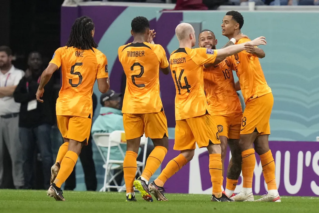 Cody Gakpo of the Netherlands celebrates his side's opening goal during the World Cup group A soccer match between the Netherlands and Qatar, at the Al Bayt Stadium in Al Khor , Qatar, Tuesday, Nov. 29, 2022. (AP Photo/Darko Bandic)