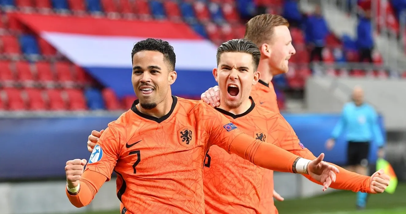 SZEKESFEHERVAR, 27-03-2021, Arena Sosto, 2020 / 2021, football, UEFA Under 21 Championships, Jong Oranje player Justin Kluivert Jong Oranje player Ferdi Kadioglu Jong Oranje player Dani de Wit celebrating the 0-1,Image: 601725234, License: Rights-managed, Restrictions: *** World Rights Except Austria and The Netherlands ***, Model Release: no