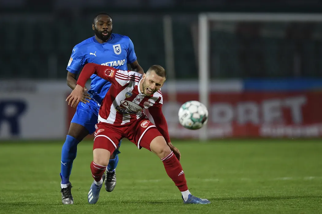 Stephane Acka (S), de la Universitatea Craiova, lupta pentru balon cu Pavol Safranko (D), de la Sepsi OSK, in meciul de fotbal din etapa 6 a play-off-ului Ligii 1, disputat pe stadionul Municipal din Sfantu Gheorghe, miercuri, 5 mai 2021. ALEX NICODIM / MEDIAFAX FOTO