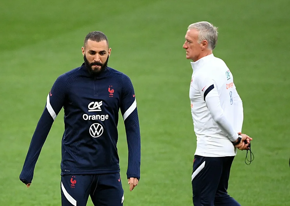 France's forward Karim Benzema (L) looks on next to France's head coach Didier Deschamps during a training session at the Olympic stadium in Kiev, on September 3, 2021 on the eve of the FIFA World Cup Qatar 2022 qualification football match between Ukraine and France.,Image: 630275437, License: Rights-managed, Restrictions: , Model Release: no