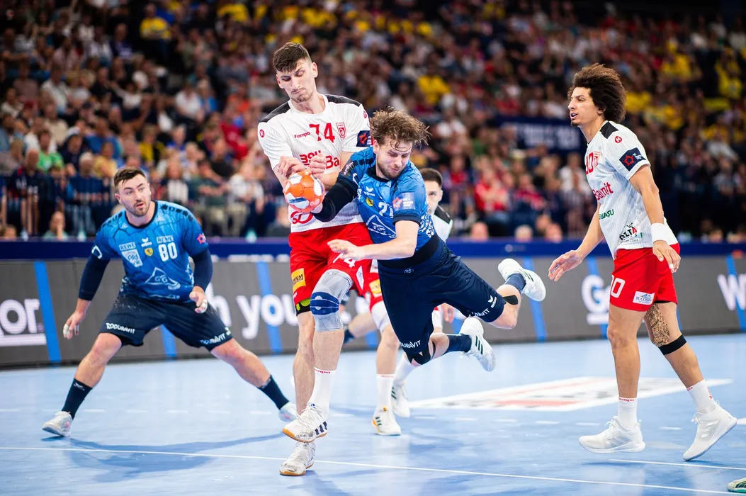 26 May 2024, Hamburg: Handball: EHF European League, Rhein Neckar Löwen - Dinamo Bucharest, Final Four, match for 3rd place, Barclays Arena. Bucharest's Viachaslau Bokhan in a duel against Berlin's Olle Forsell Schefvert.,Image: 876610867, License: Rights-managed, Restrictions: , Model Release: no