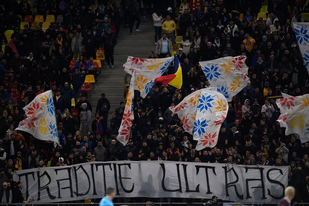 Romanian fans in action during the UEFA EURO 2024 qualifying round group I match between Romania and Belarus at Arena Nationala on March 28, 2023 in Bucharest, Romania.