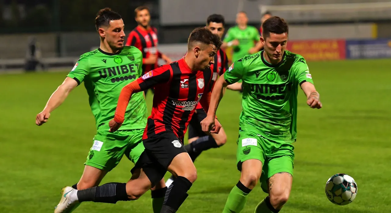 Paul Viorel Anton, George Cristian Merloi si Steliano Filip in meciul de fotbal dintre Astra Giurgiu si Dinamo Bucuresti, contand pentru semifinala tur a Cupei Romaniei, desfasurat fara spectatori pe Stadionul Marin Anastasovici din Giurgiu, marti 13 aprilie 2021. © FOTO:Razvan Pasarica/SPORT PICTURES