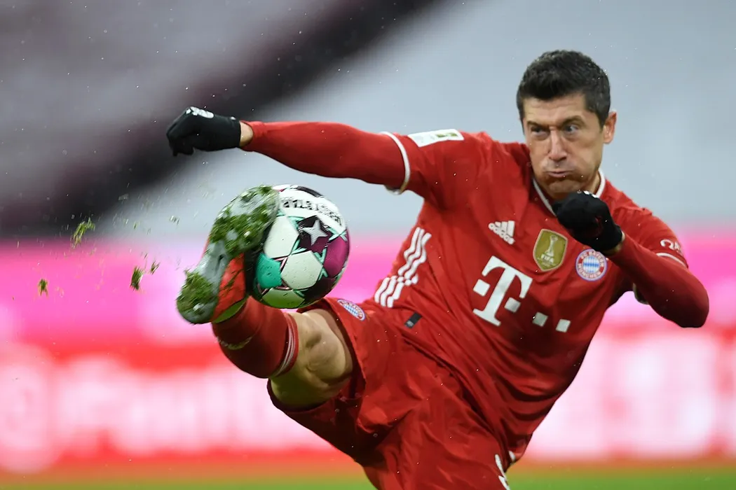 15 February 2021, Bavaria, Munich: Football: Bundesliga, FC Bayern München - Arminia Bielefeld, Matchday 21 at Allianz Arena. Munich's Robert Lewandowski plays the ball. Photo: Andreas Schaad/AP-Pool/dpa - IMPORTANT NOTE: In accordance with the regulations of the DFL Deutsche Fußball Liga and/or the DFB Deutscher Fußball-Bund, it is prohibited to use or have used photographs taken in the stadium and/or of the match in the form of sequence pictures and/or video-like photo series.,Image: 591226449, License: Rights-managed, Restrictions: GERMANY OUT