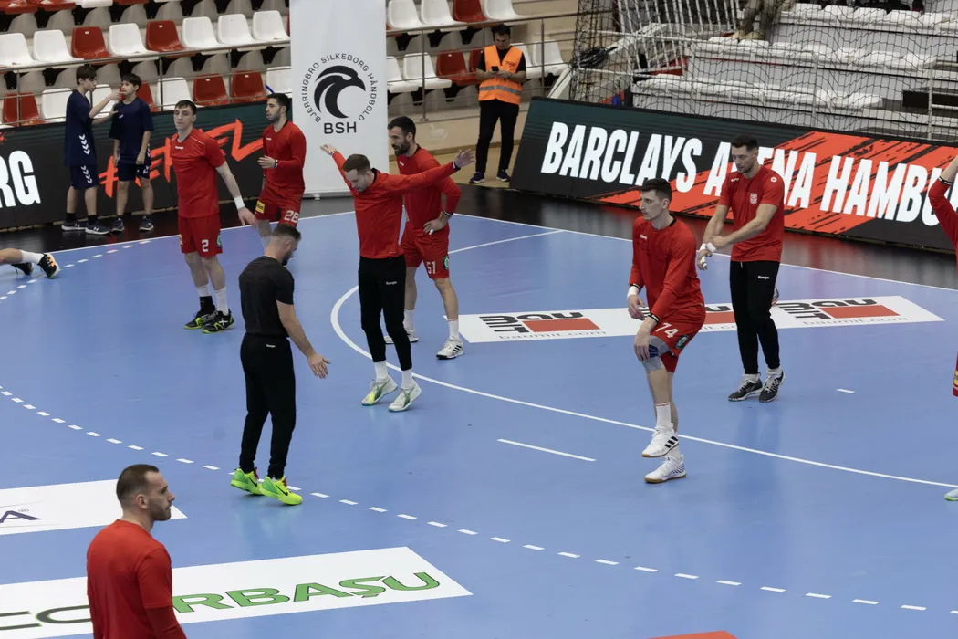 Handbaliștii dinamoviști la încălzire înaintea meciului de handbal masculin dintre CS Dinamo București si Bjerringbro-Silkeborg, contând pentru EHF EUROPA LEAGUE 2023/24, desfășurat in Sala Dinamo din București, marți 26 martie 2024. © FOTO: Mihai NEACSU/SPORT PICTURES