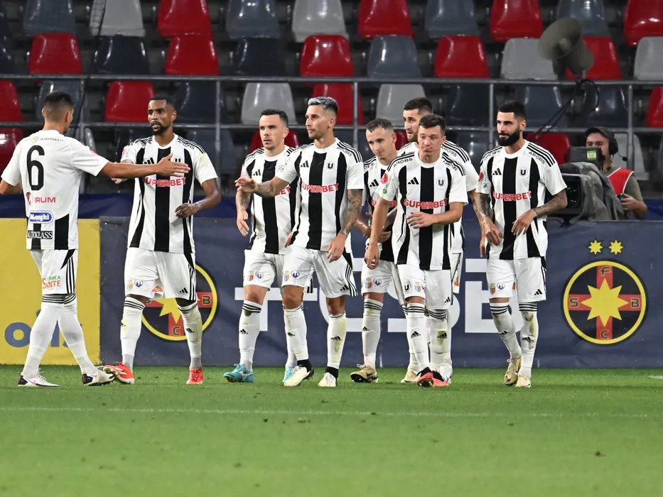 Bucurie a fotbalistilor clujeni Adel Bettaieb, Dan Nicolae Nistor, Ovidiu Alexandru Bic, Robert Mihai Silaghi, Ovidiu Marian Popescu, Vadim Rata si Radu Stefanita Boboc dupa un gol marcat in meciul dintre FCSB si Universitatea Cluj, contand pentru Superliga Superbet, desfasurat pe Stadionul Steaua-Ghencea din Bucuresti, sambata 13 iulie 2024. © FOTO:Razvan Pasarica/SPORT PICTURES