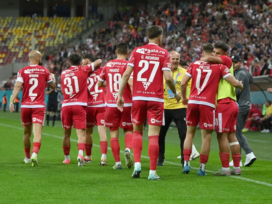 Bucurie a fotbaliștilor dinamoviști după un gol marcat de catre Dennis Dorin Politic in meciul de fotbal dintre Dinamo Bucuresti si FK Csikszereda Miercurea Ciuc, barajul tur pentru mentinerea/retrogradarea din Superliga Superbet, desfasurat pe Arena Nationala din Bucuresti, luni 20 mai 2024.,Image: 877324984, License: Rights-managed, Restrictions: , Model Release: no
