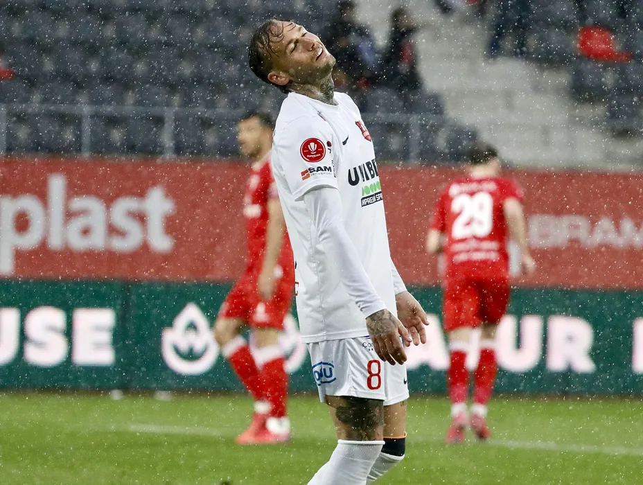 Alesssandro Murgia dezamagit in meciul de fotbal dintre AFC Hermannstadt Sibiu si UTA Arad, contand petru Superliga Superbet - Play-Out, desfasurat pe Stadionul Municipal din Sibiu, sambata 26 aprilie 2025. © FOTO: Valentin Macrea/SPORT PICTURES